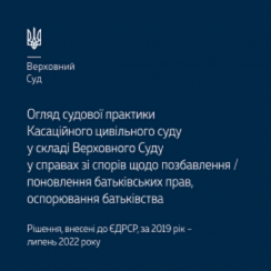 До огляду внесено низку важливих правових висновків КЦС ВС, висловлених у справах зі спорів щодо позбавлення / поновлення батьківських прав, оспорювання батьківства, які матимуть значення для формування єдиної правозастосовної практики. Серед цих висновків слід виокремити такі: