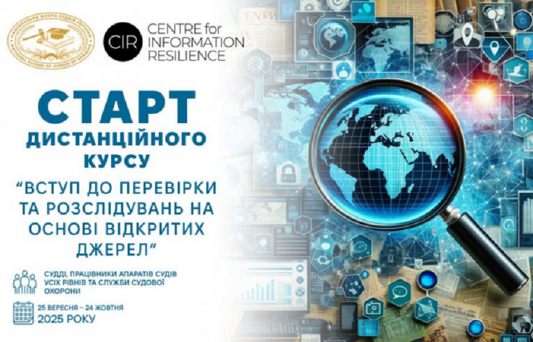 Національна школа суддів України оголошує набір на дистанційний курс "Вступ до перевірки та розслідувань на основі відкритих джерел", розроблений Центром інформаційної стійкості (Centre for Information Resilience).