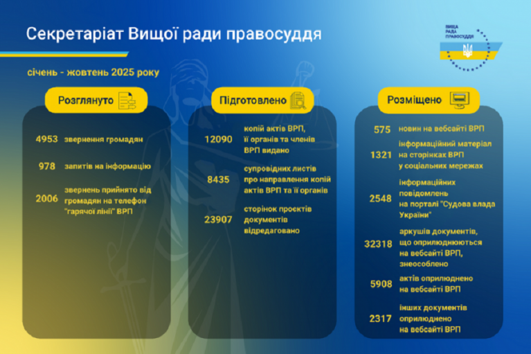 4953 звернення громадян та 978 запитів на інформацію опрацьовано співробітниками секретаріату Вищої ради правосуддя протягом десяти місяців 2025 року.