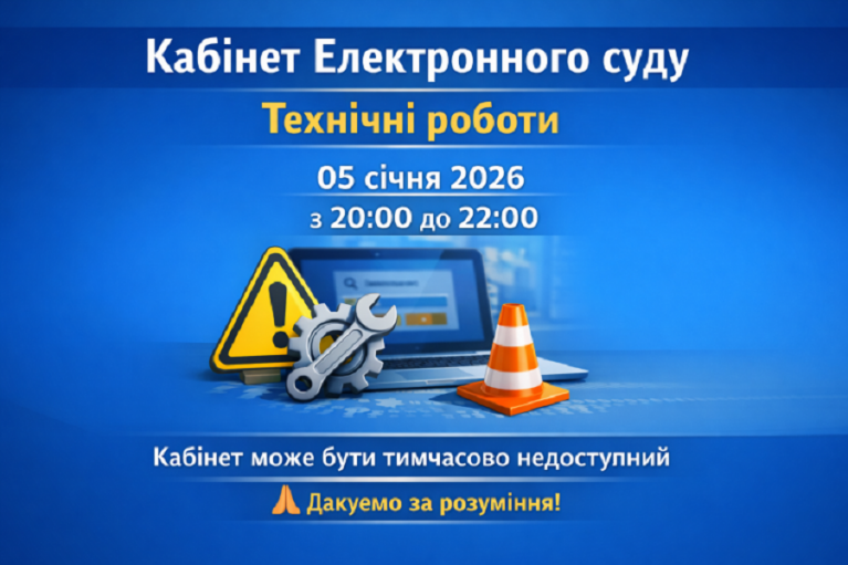 Державне підприємство "Інформаційні судові системи" повідомляє, що 5 січня 2026 року з 20:00 до 22:00 у Кабінеті Електронного суду проводитимуться планові технічні роботи.