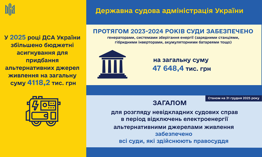Державна судова адміністрація України усвідомлює критичну важливість безперервного функціонування судів в умовах ускладненої безпекової та енергетичної ситуації, тому постійно відстежує стан забезпечення судів альтернативними джерелами електроживлення, координує дії територіальних управлінь та вживає комплексних організаційних і технічних заходів для мінімізації ризиків порушення правосуддя.