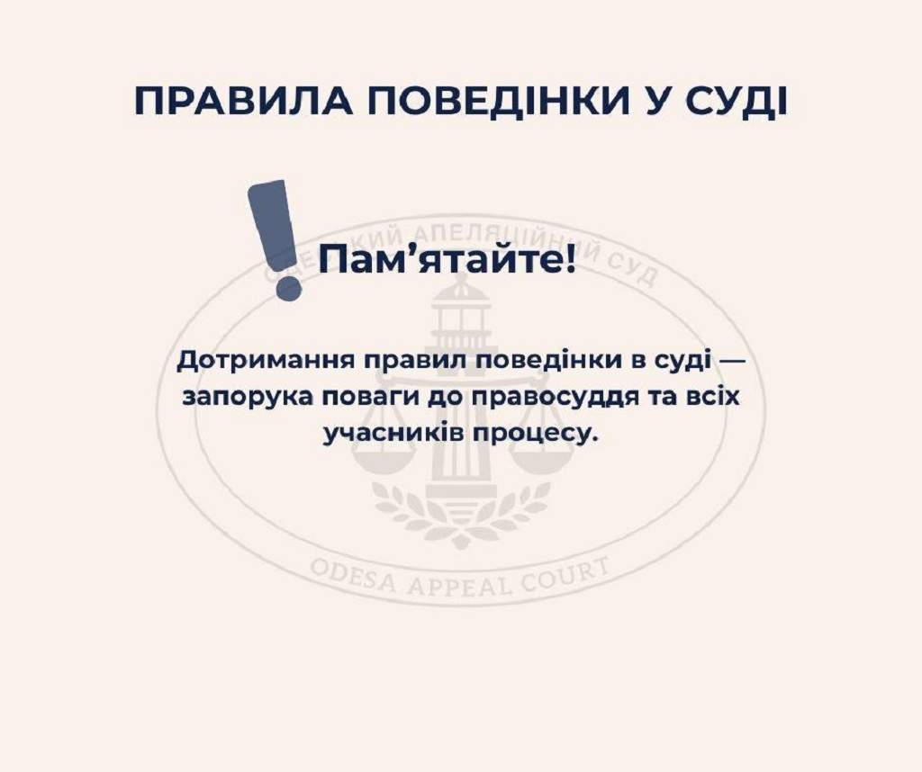 З метою інформування відвідувачів та учасників судових процесів про основні правила поведінки у суді Одеський апеляційний суд підготував наочну інфографіку.